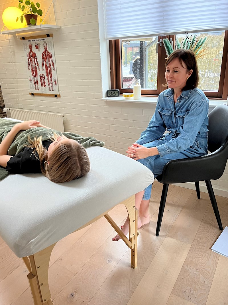 Vi har først en snak omkring, hvad der fylder og hvad barnet/den unge gerne vil opnå. Dernæst sender vi eventuelt mor/far ud af lokalet og så kommer barnet/den unge op på briksen og bliver puttet godt med tæppe og derefter starter behandlingen på briksen. Afslutningsvis snakker vi, hvad der skal arbejdes med til næste gang vi ses.